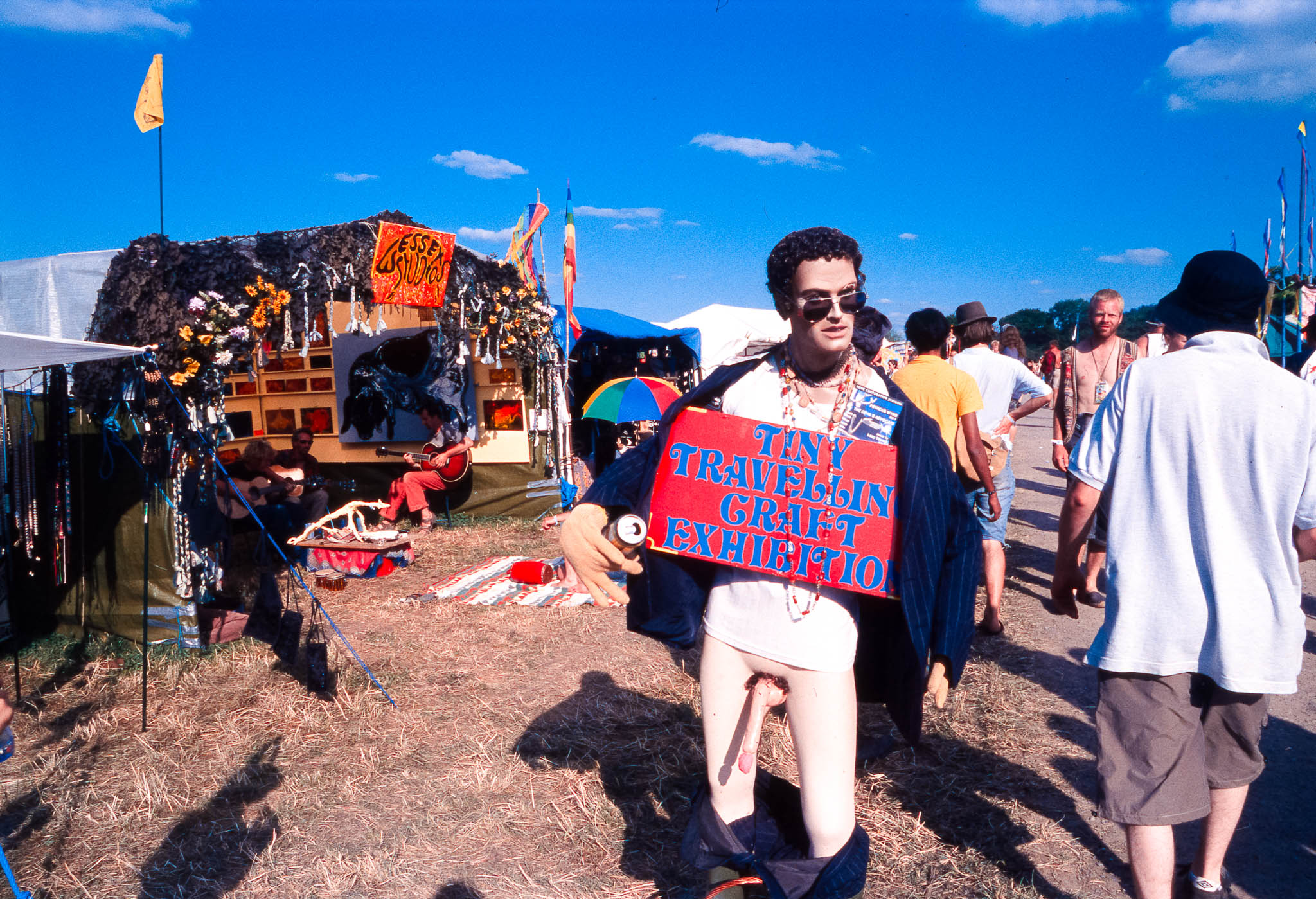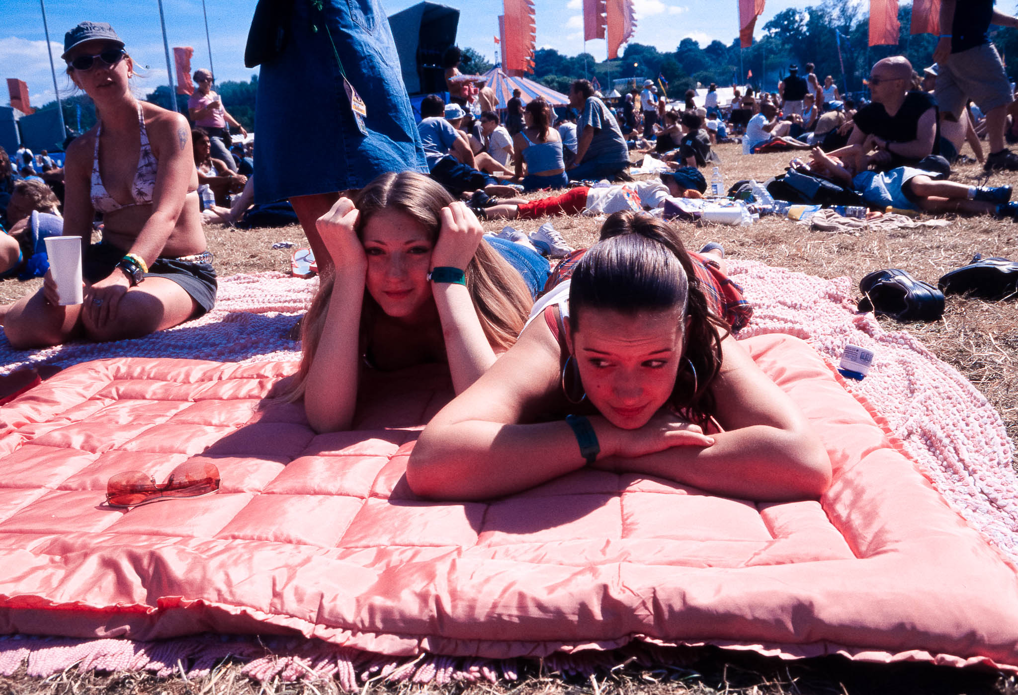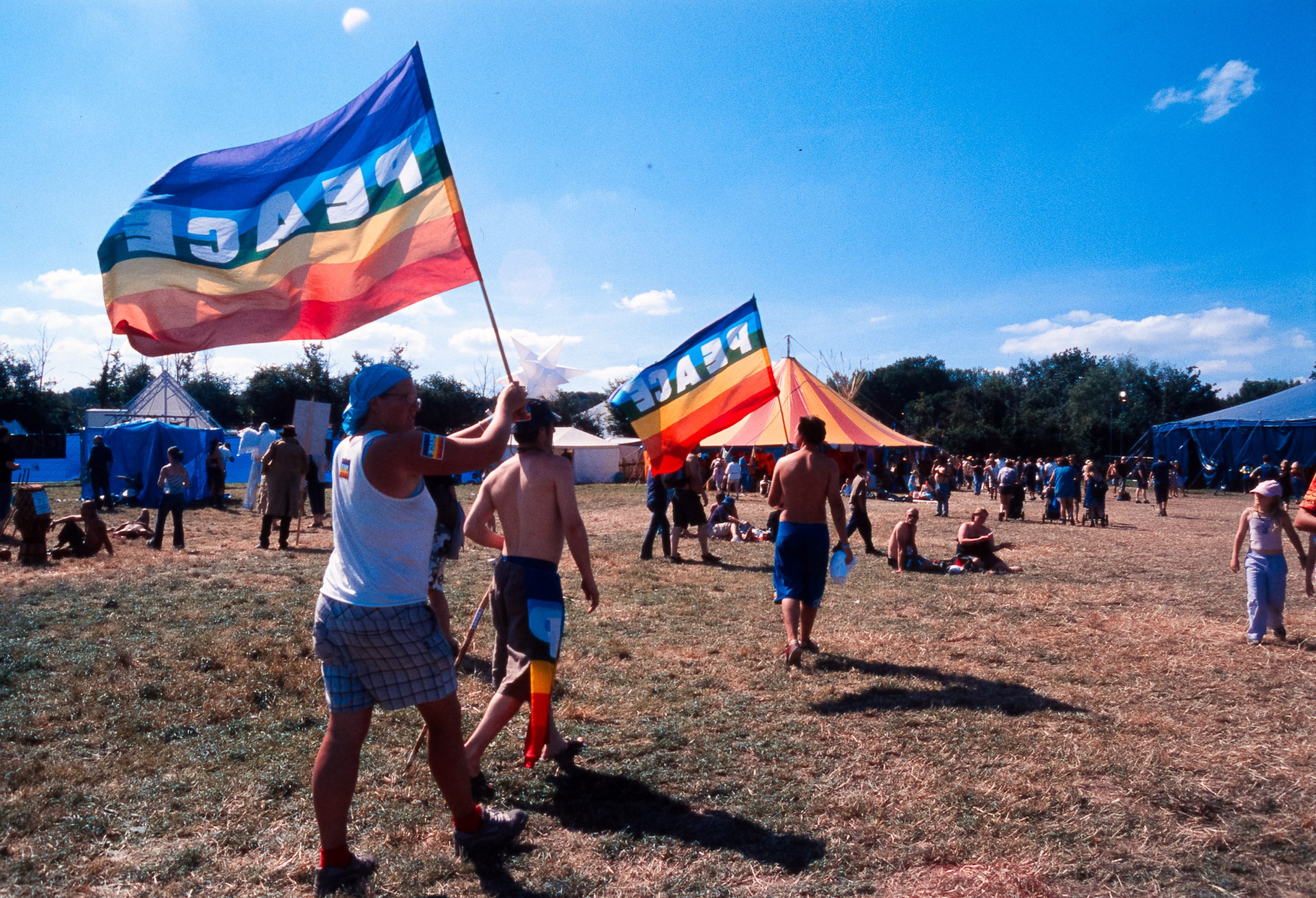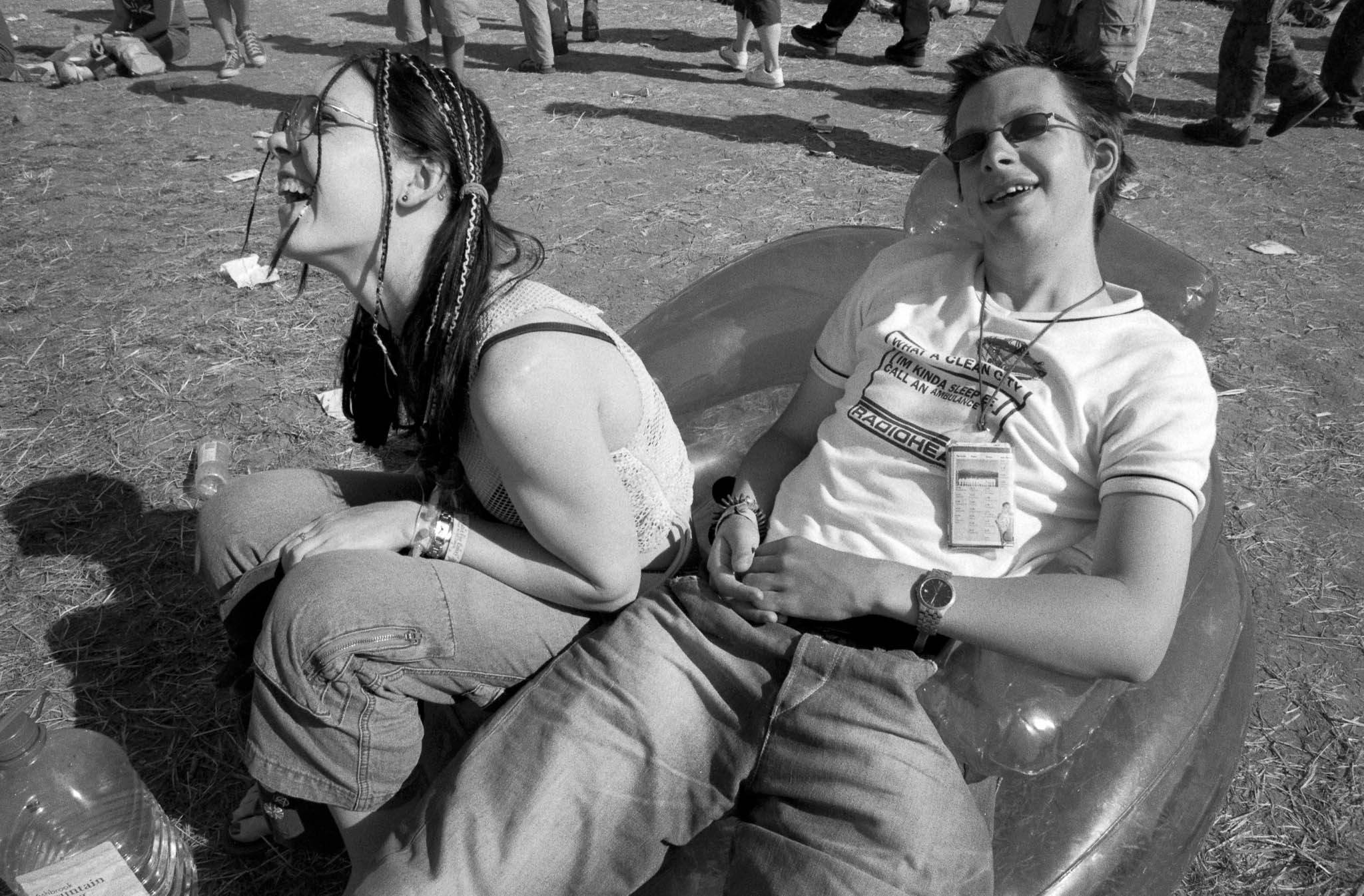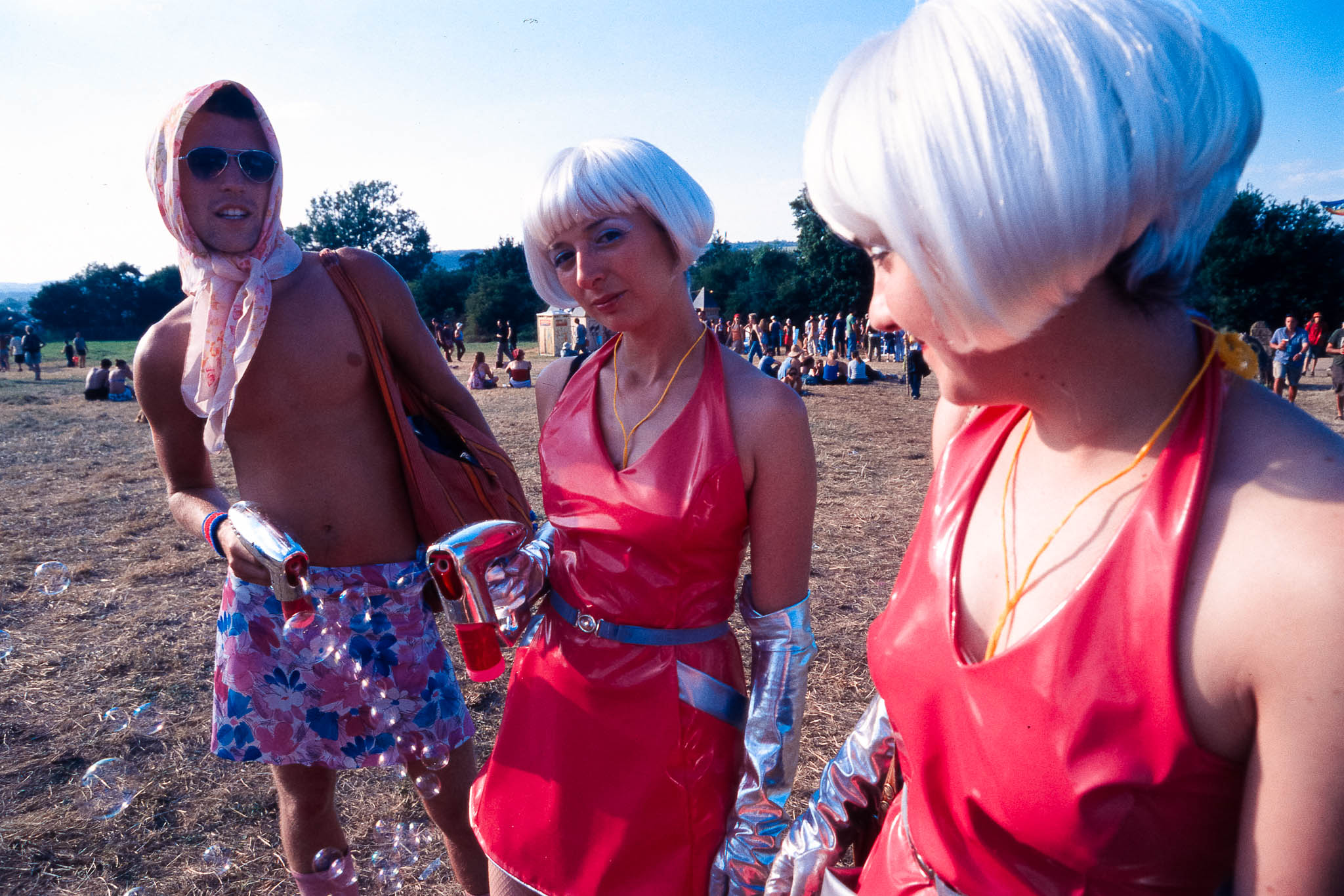 The main reason we went to Glasto 03 was to enjoy the whole event—the music, the vibes, the perfect, sunny weather, and acts like R.E.M., Radiohead, and Fatboy Slim. The photos were just a fun side project; I took my film camera (brought my first digital Nikon D100 just a few weeks later to take to Ibiza) I used black and white and colour film to snap the atmosphere and colours as we wandered around.