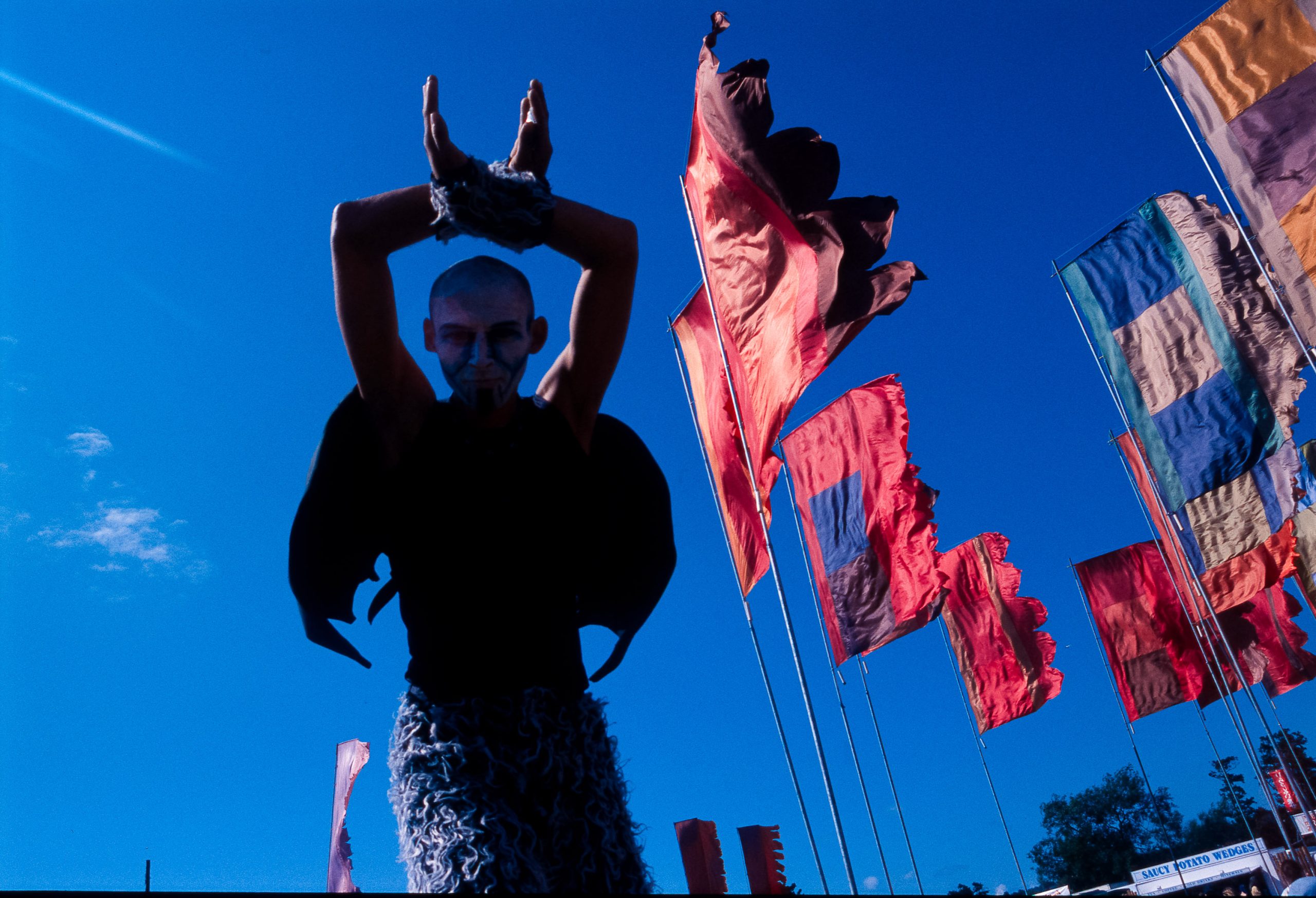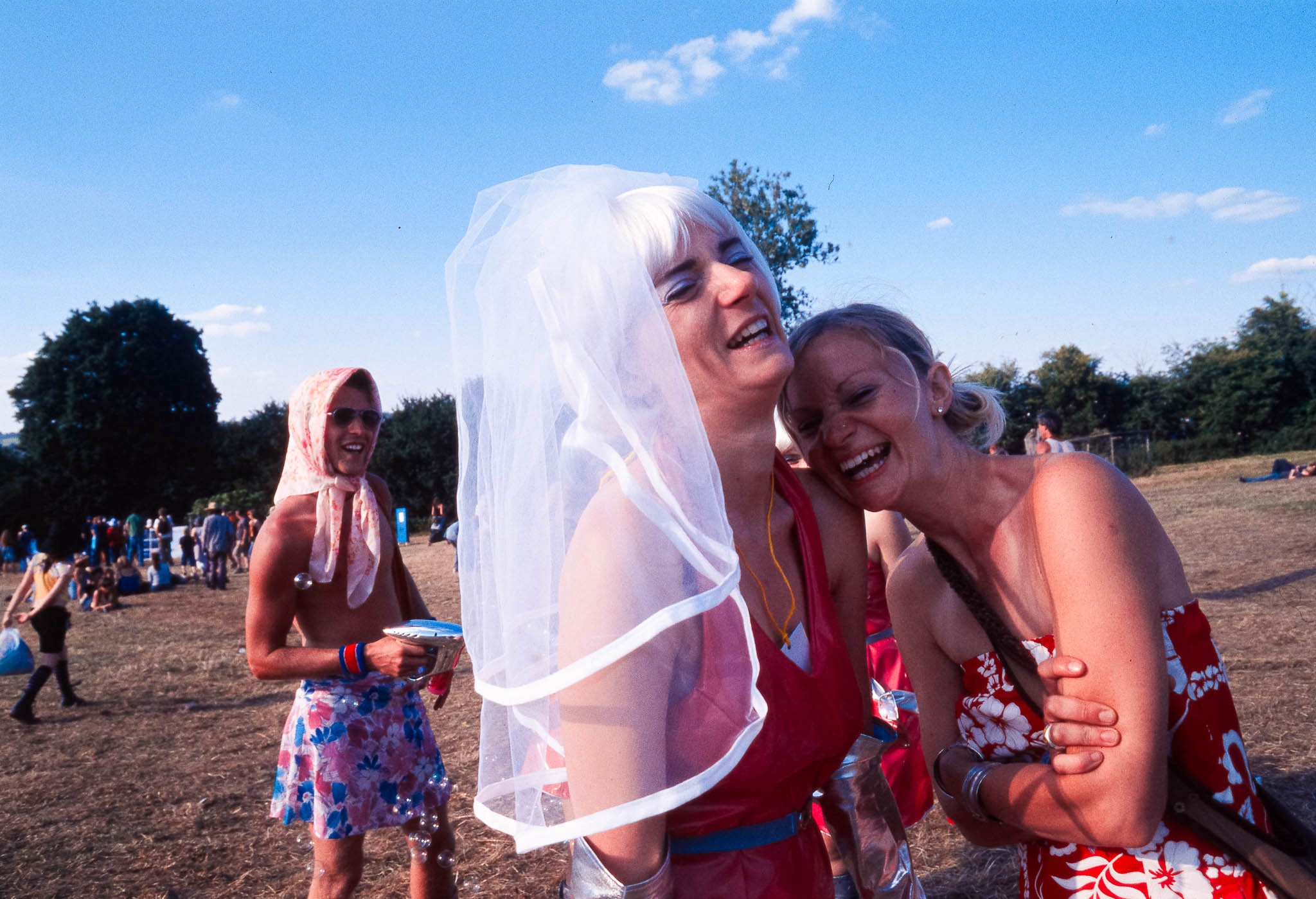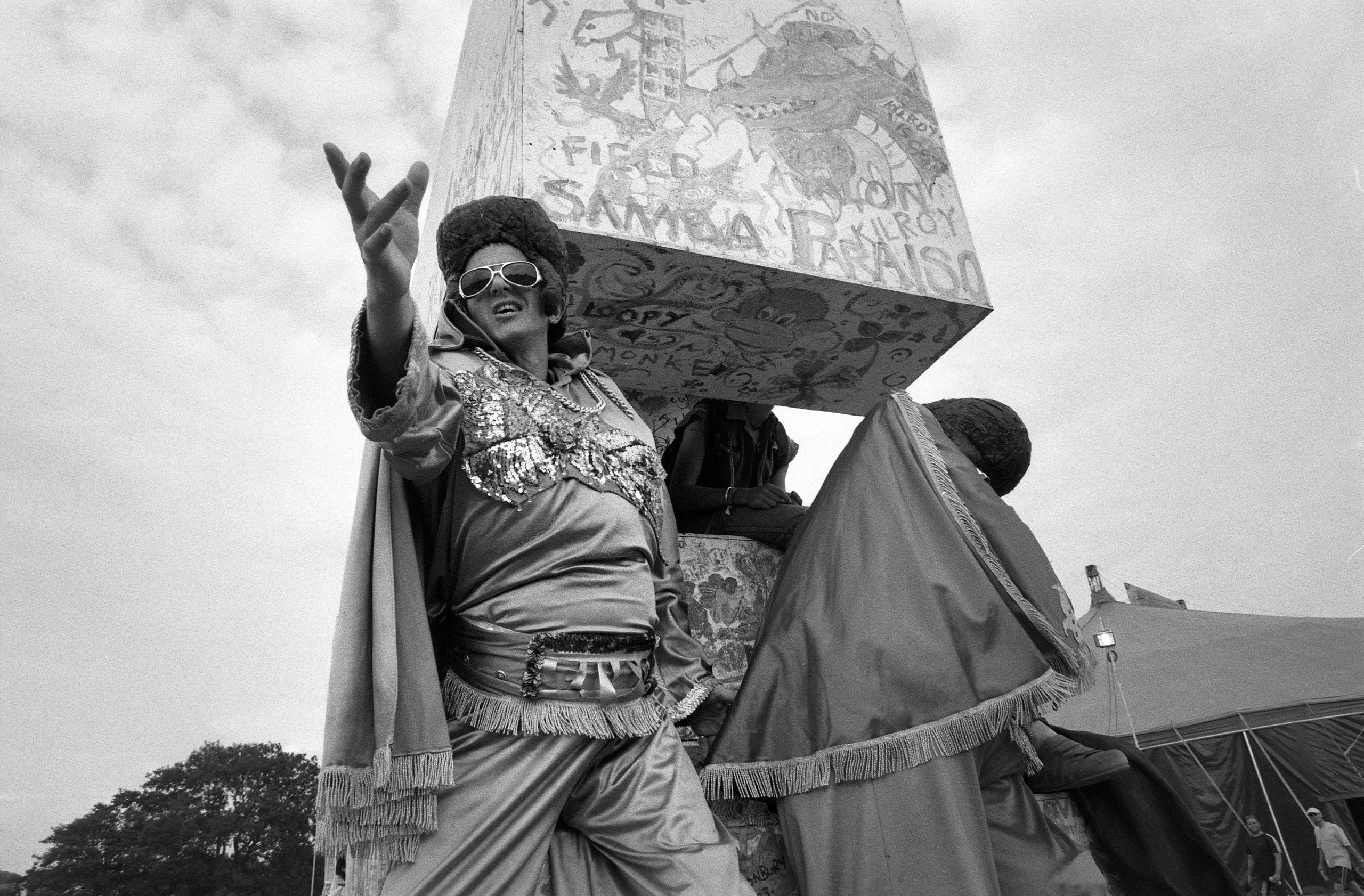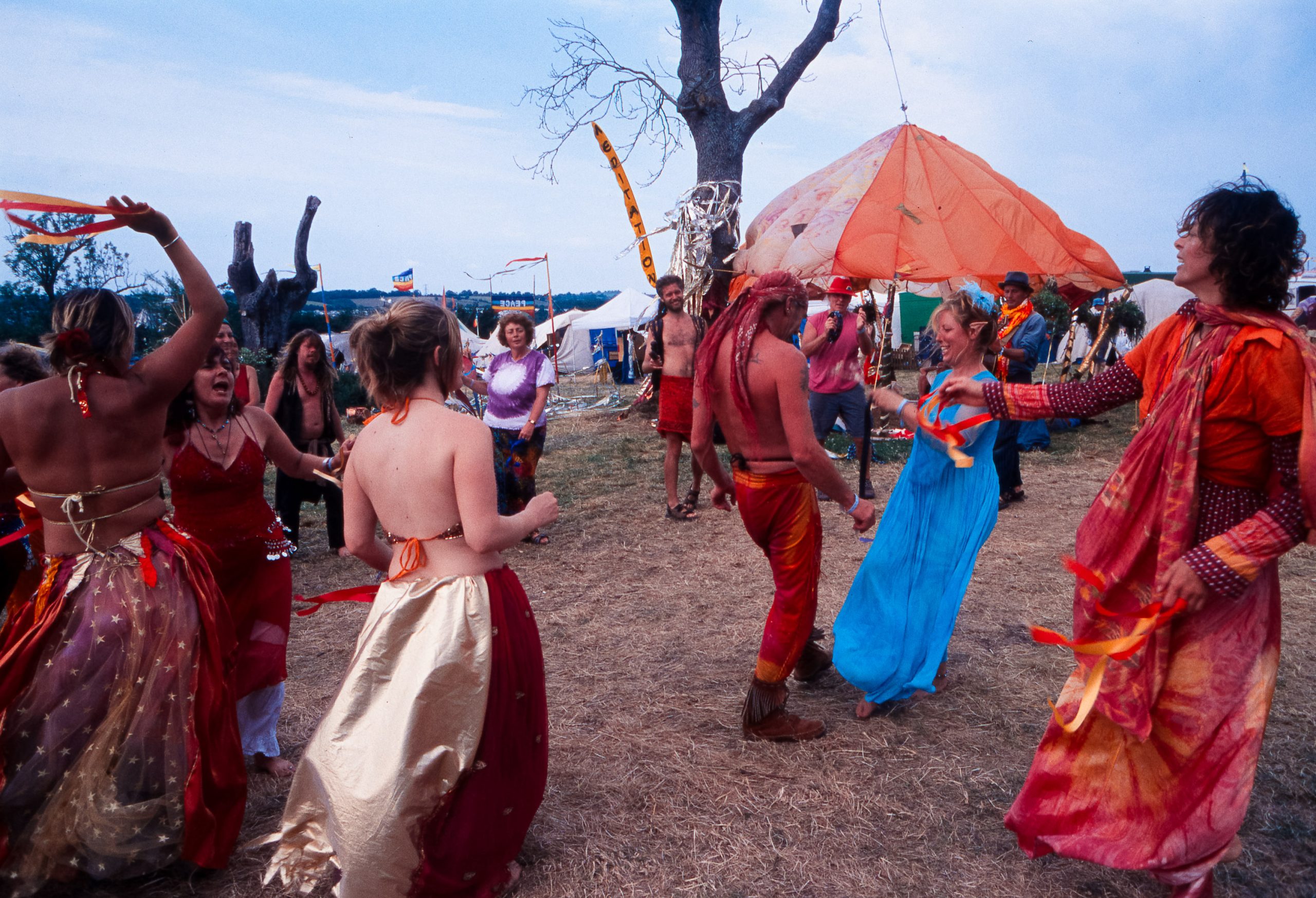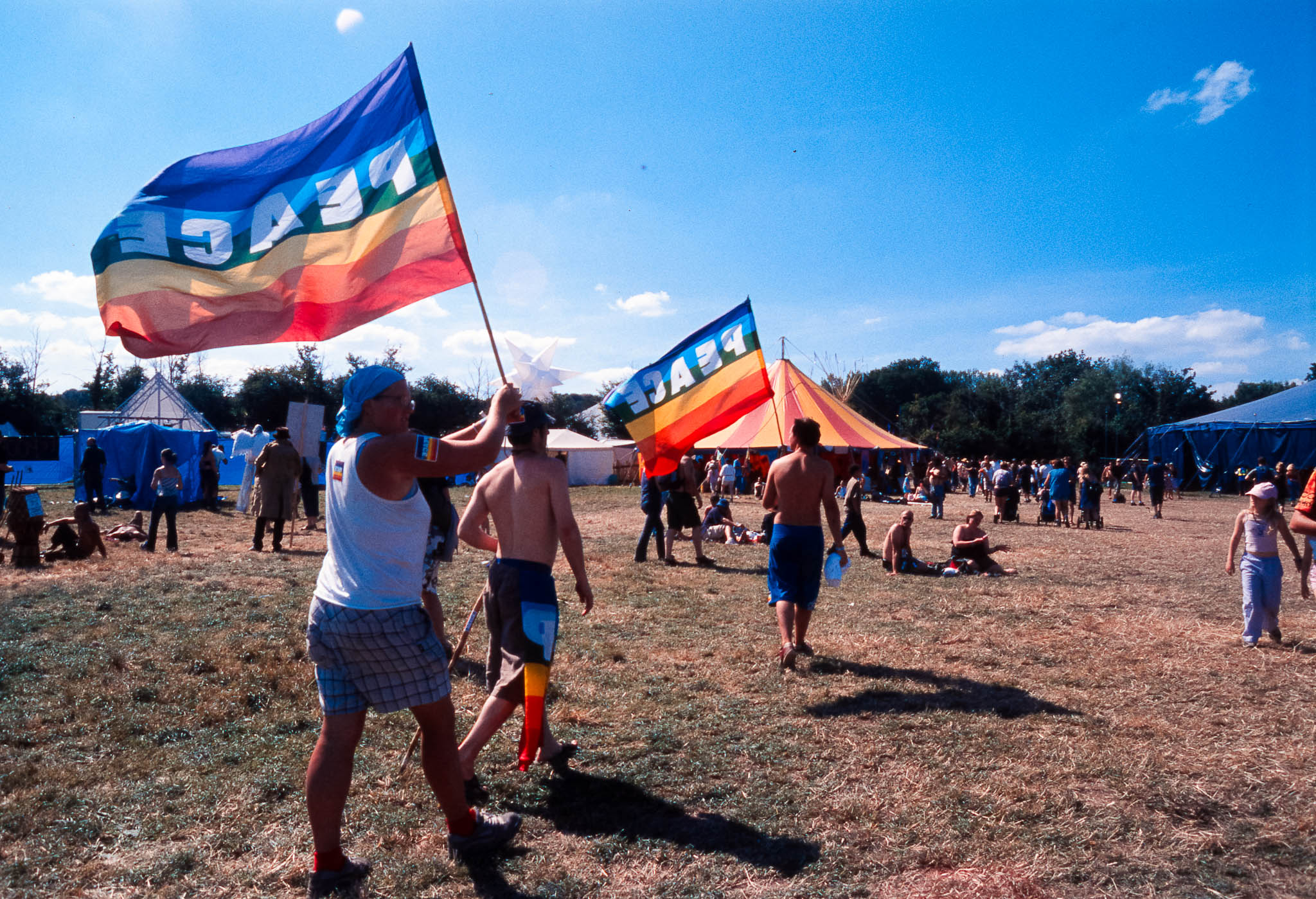 The main reason we went to Glasto 03 was to enjoy the whole event—the music, the vibes, the perfect, sunny weather, and acts like R.E.M., Radiohead, and Fatboy Slim. The photos were just a fun side project; I took my film camera (brought my first digital Nikon D100 just a few weeks later to take to Ibiza) I used black and white and colour film to snap the atmosphere and colours as we wandered around.