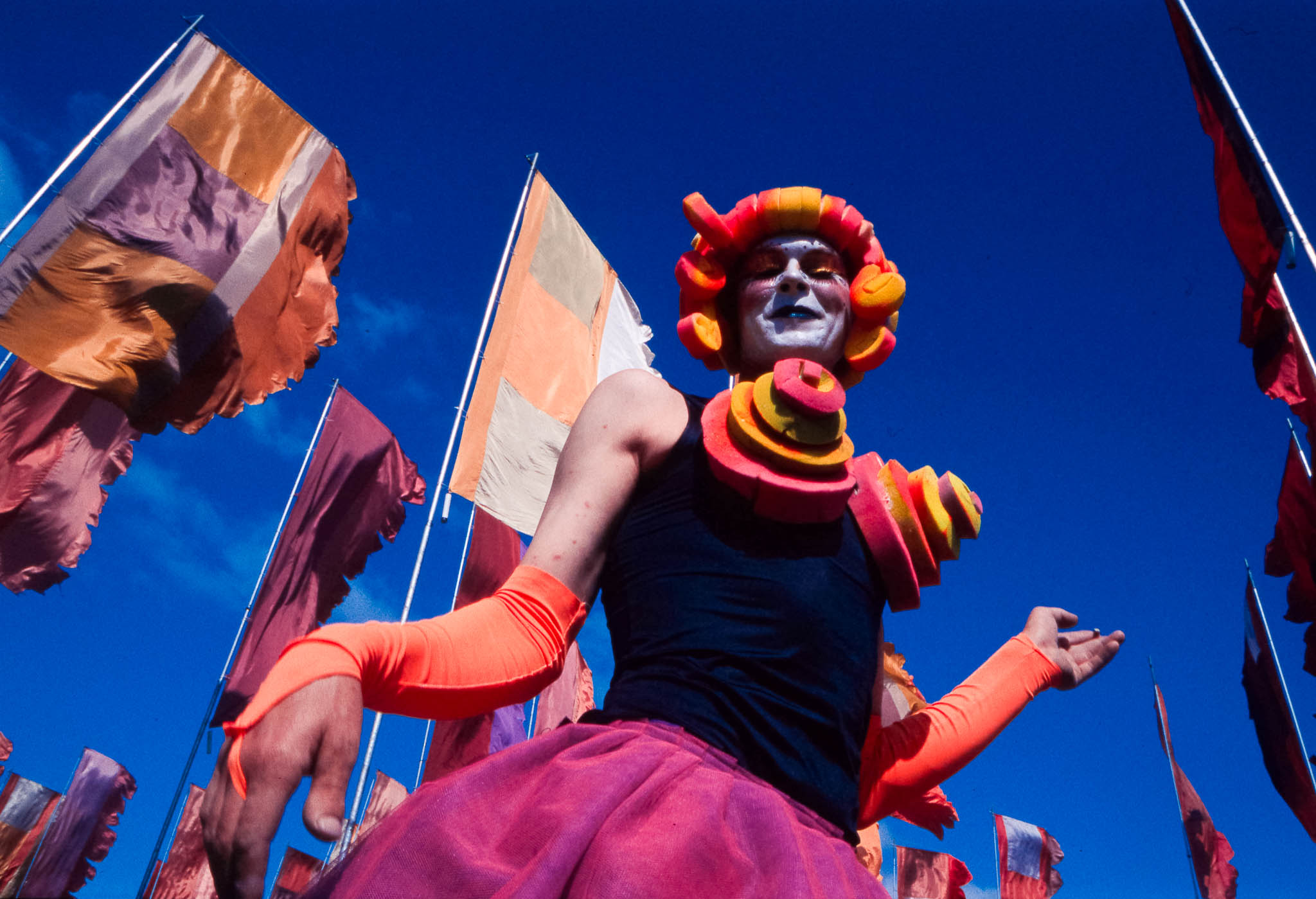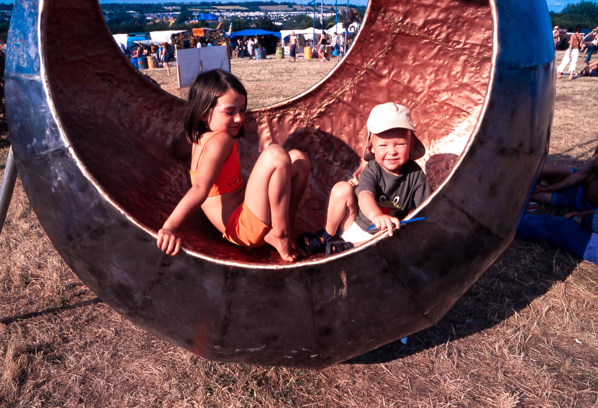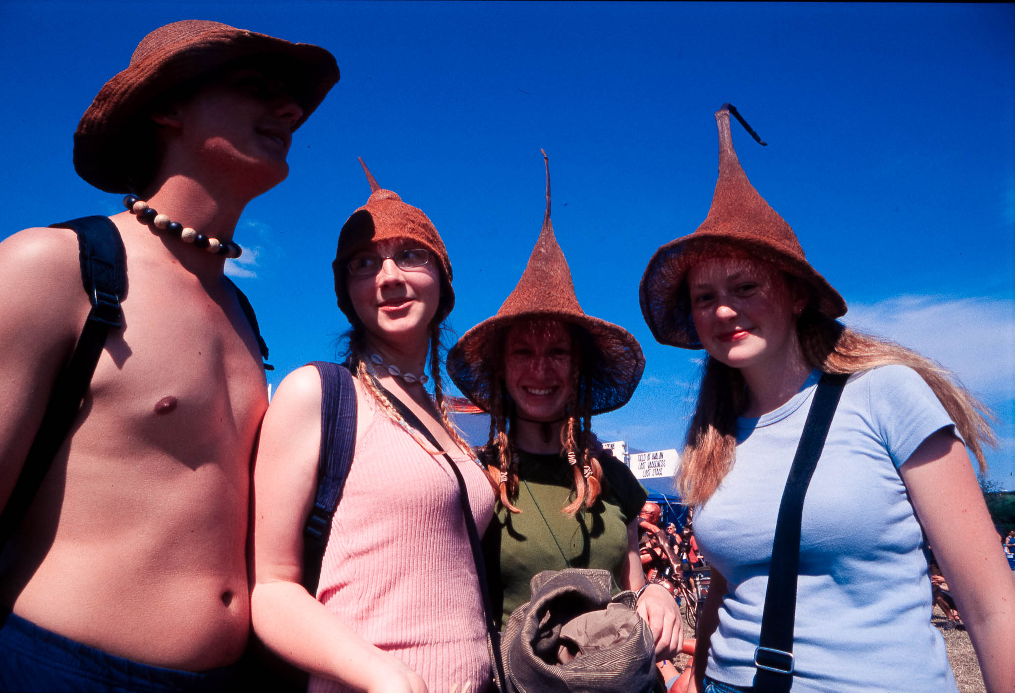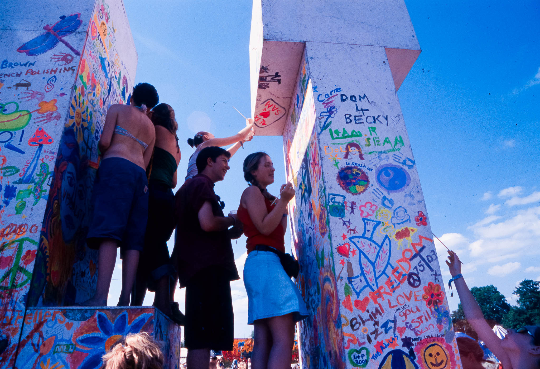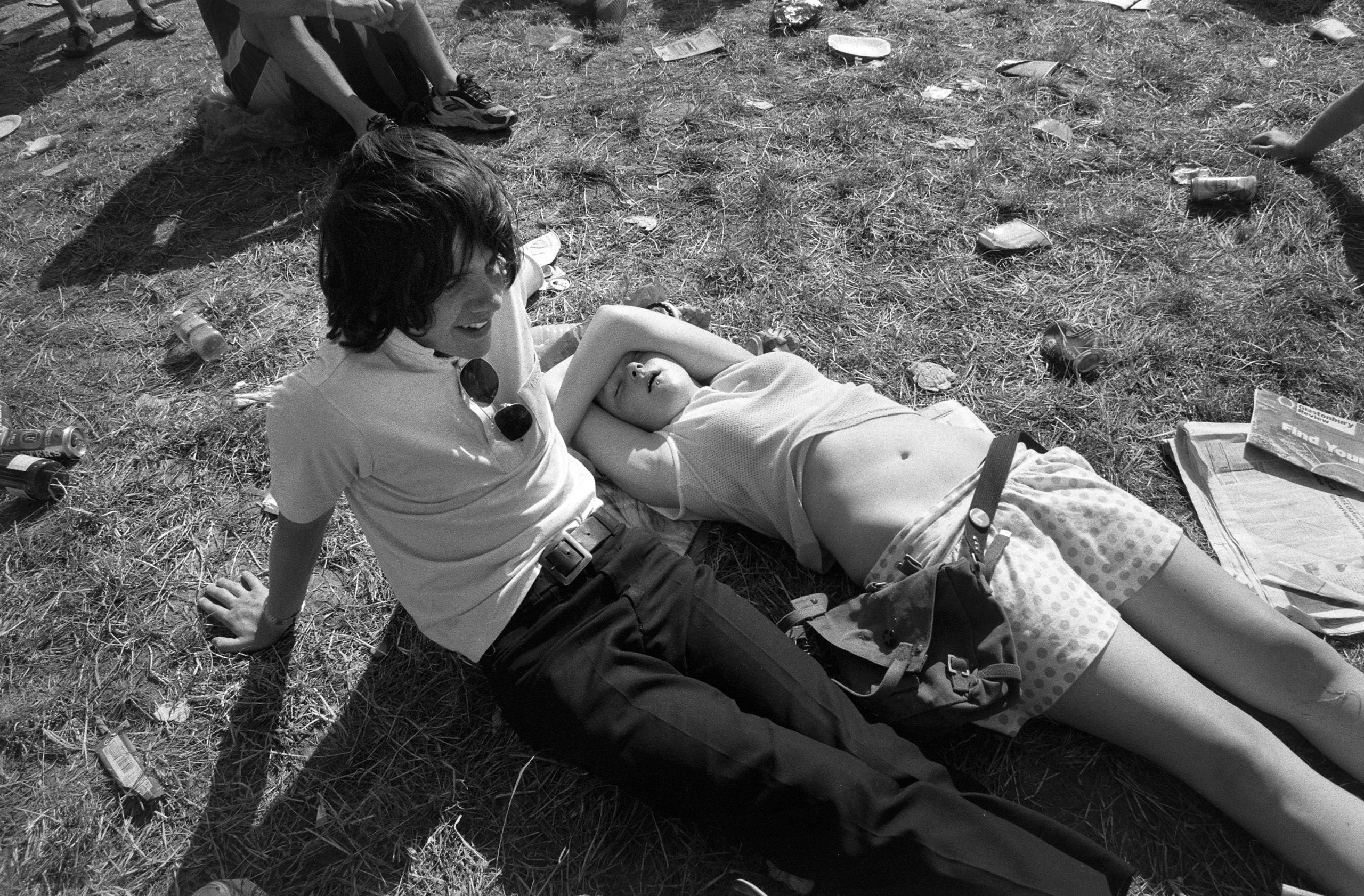 The main reason we went to Glasto 03 was to enjoy the whole event—the music, the vibes, the perfect, sunny weather, and acts like R.E.M., Radiohead, and Fatboy Slim. The photos were just a fun side project; I took my film camera (brought my first digital Nikon D100 just a few weeks later to take to Ibiza) I used black and white and colour film to snap the atmosphere and colours as we wandered around.
