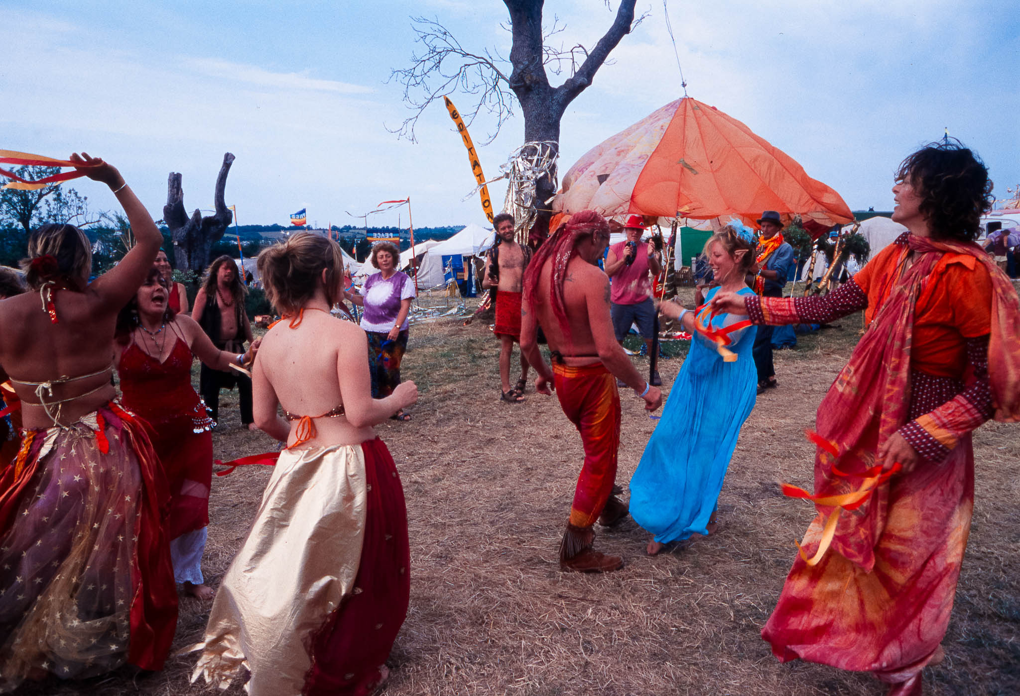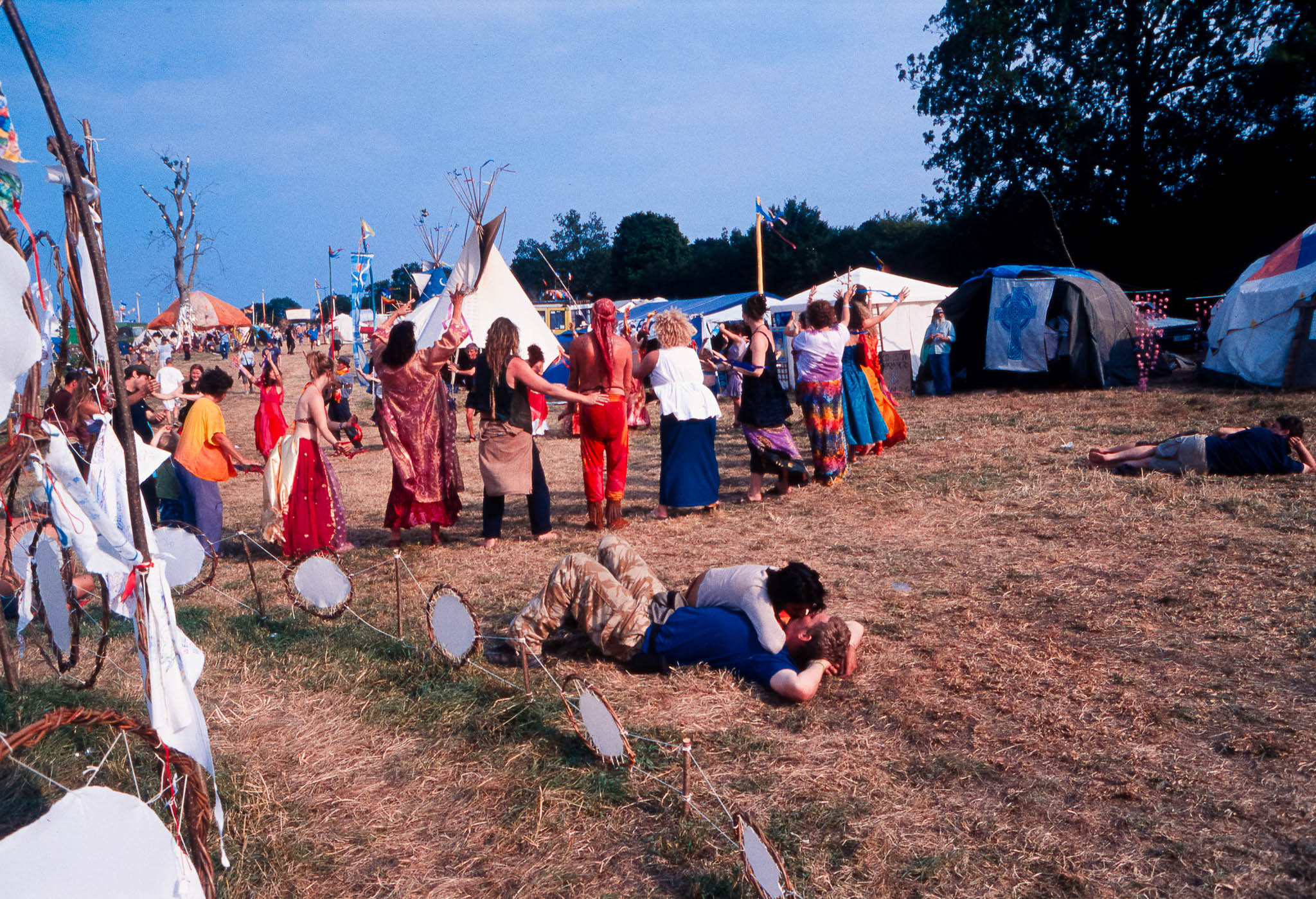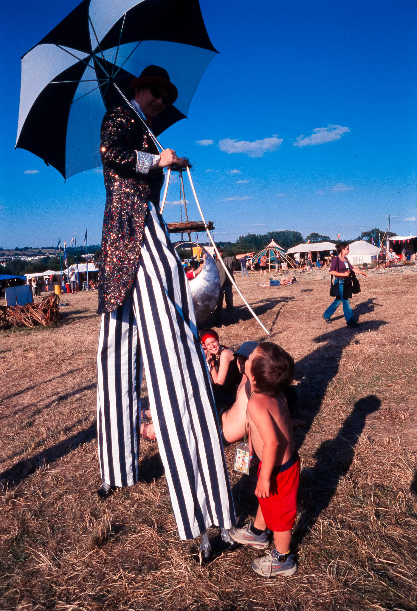 At Glastonbury 2003, the Green Fields offered a peaceful haven for the festival's traditional hippy and well-being activities. Away from the main stages, the entire site was buzzing with colourful, spontaneous dancing and street performers who put on constant, quirky theatre and circus shows.