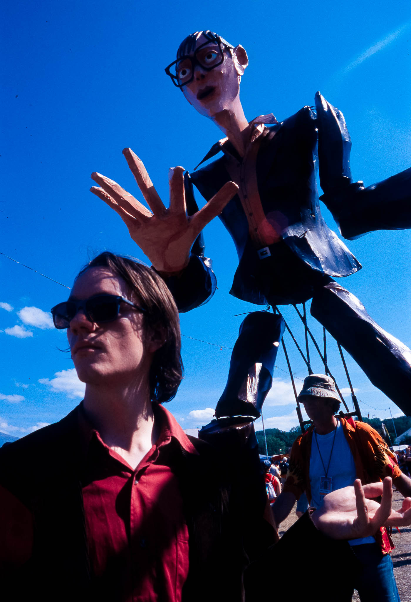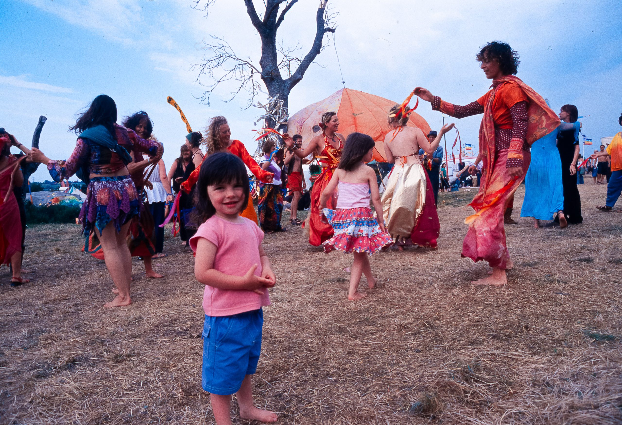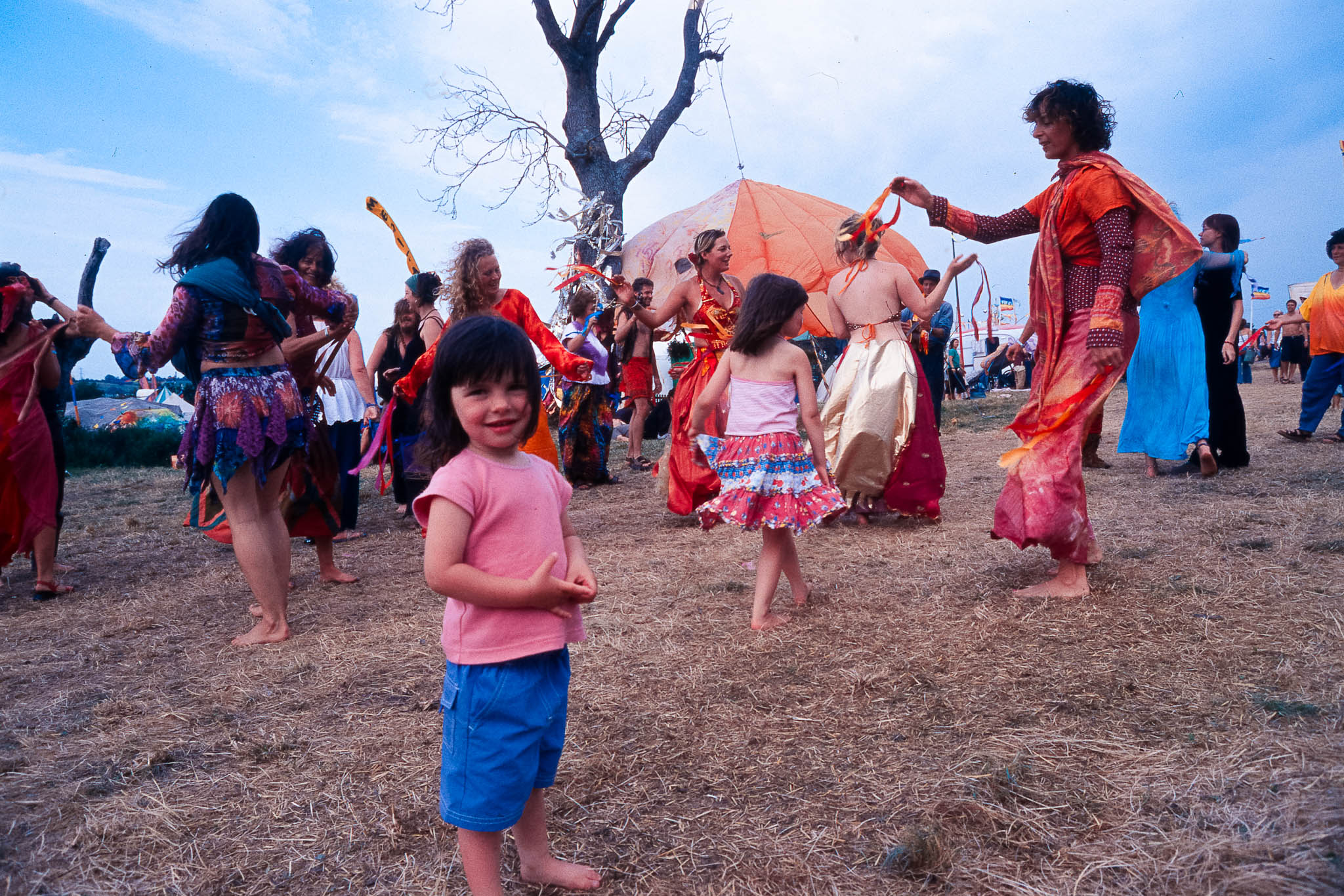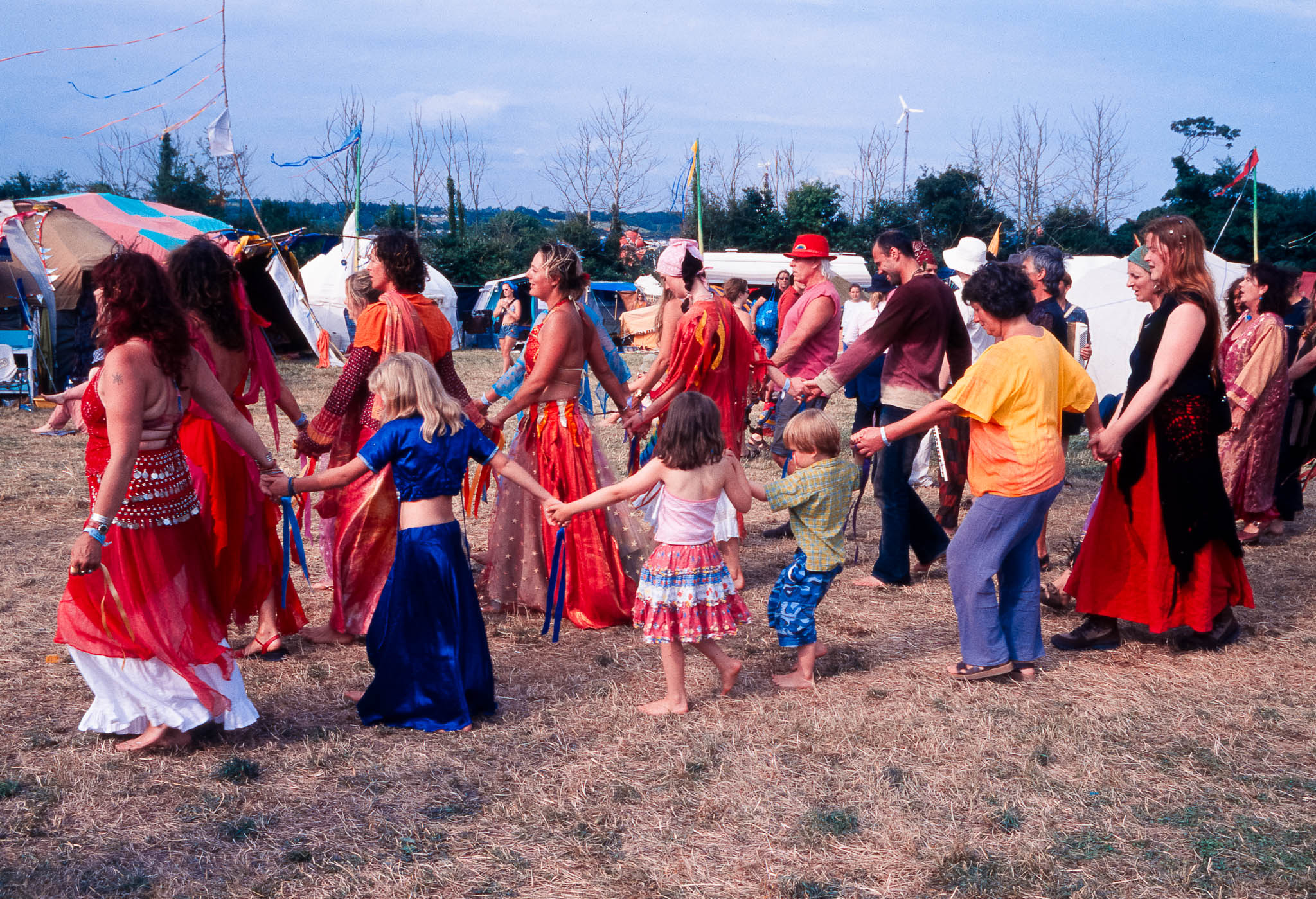 At Glastonbury 2003, the Green Fields offered a peaceful haven for the festival's traditional hippy and well-being activities. Away from the main stages, the entire site was buzzing with colourful, spontaneous dancing and street performers who put on constant, quirky theatre and circus shows.