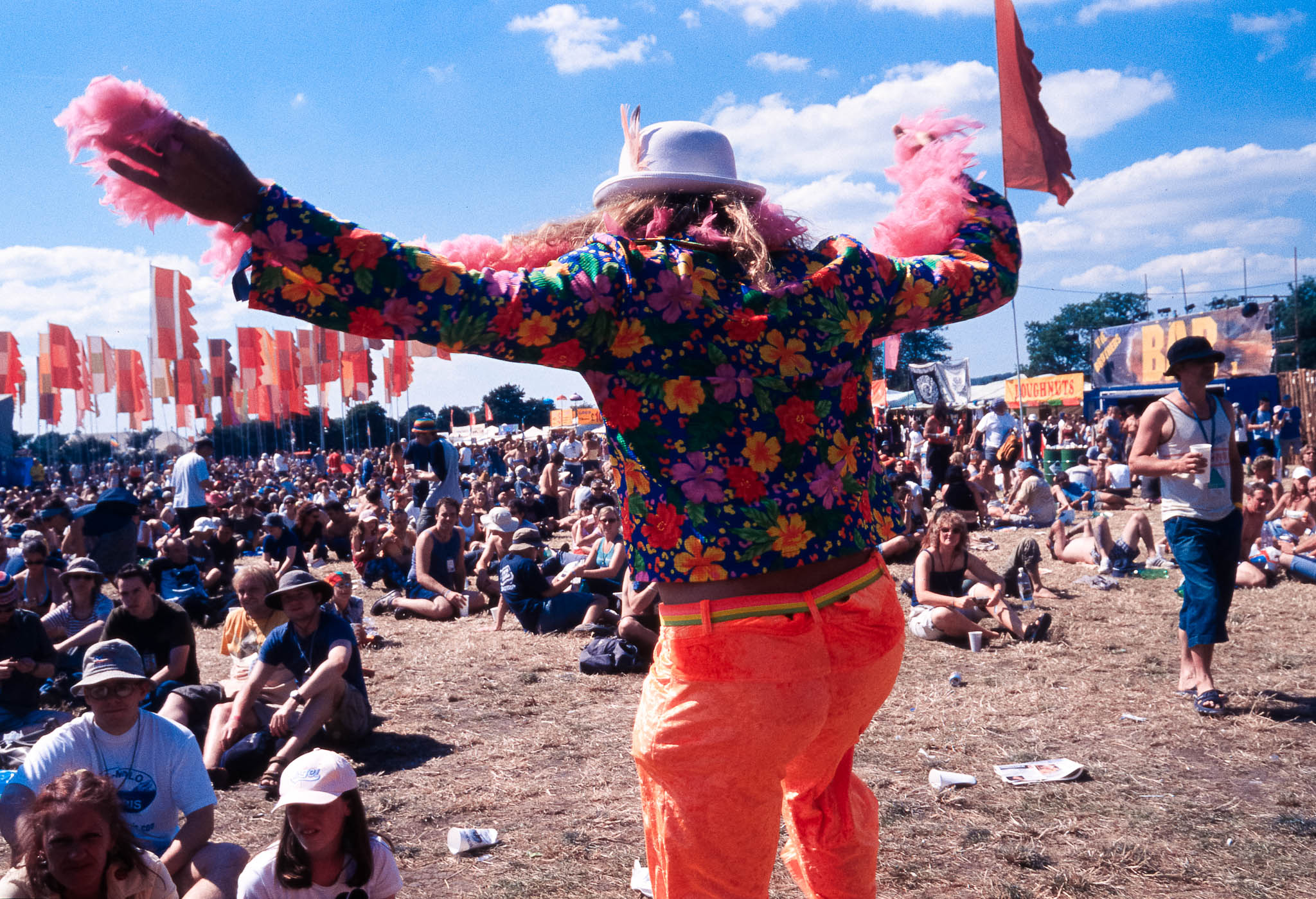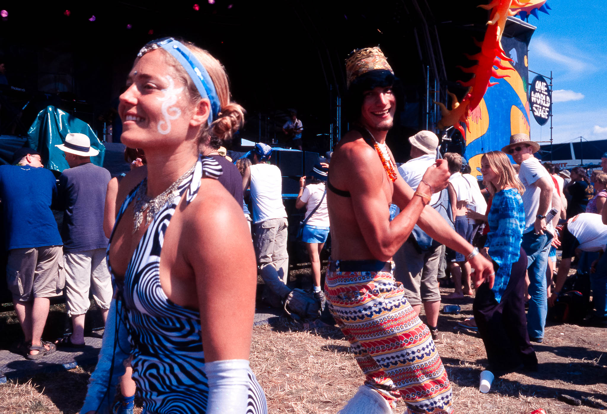 In stark contrast to the infamous brown mud of other years, the dominant visuals were the blue of the sky and the bright green/yellow of the dry, dusty fields, often complemented by the vibrant colours of summer clothing and festival decorations.