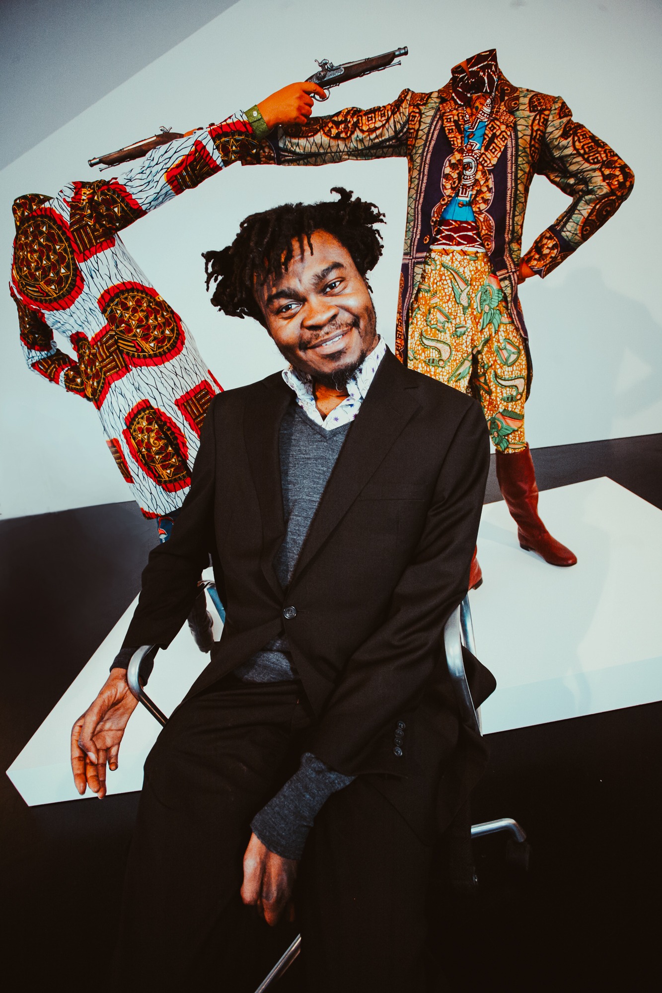 Yinka Shonibare MBE with his work at the Stephen Friedman Gallery, London